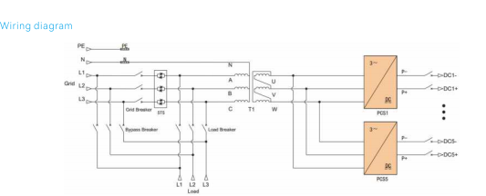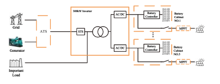 विशेषता सिस्टम समानांतर कॉन्फ़िगरेशन में मॉड्यूलर इन्वर्टर इकाइयों का उपयोग करता है, जहां प्रत्येक इन्वर्टर मॉड्यूल का डीसी इनपुट एक समर्पित बैटरी कैबिनेट से मेल खाता है, प्रति-क्लस्टर प्रबंधन को बीच में प्रसारित धाराओं को खत्म करने में सक्षम बनाना बैटरी तार. एसी/डीसी पावर मॉड्यूल मात्रा और दोनों में लचीली तैनाती का समर्थन करते हैं पावर रेटिंग, 5-यूनिट समानांतर में 60 किलोवाट मॉड्यूल की अधिकतम क्षमता के साथ विन्यास। पावर मॉड्यूल से एसी आउटपुट एक ट्रांसफार्मर के माध्यम से वितरित किया जाता है पृथक आउटपुट चरण, मजबूत प्रतिरोध के साथ लोड को बिजली की आपूर्ति करता है वर्तमान झटका. हाइब्रिड ईएसएस उच्च उपलब्धि प्राप्त करते हुए डीसी-युग्मित फोटोवोल्टिक एकीकरण को नियोजित करता है ऊर्जा रूपांतरण दक्षता और पीवी के साथ ऑफ-ग्रिड परिदृश्यों के लिए अनुकूलित उत्पादन क्षमता भार मांग से अधिक है; आउटडोर-रेटेड एमपीपीटी नियंत्रक कंबाइनर और एमपीपीटी कार्यात्मकताओं को एक ही कठोर बाड़े में एकीकृत करें। संपूर्ण प्रणाली में एक डीजल जनरेटर एटीएस विकल्प, एक 300 किलोवाट हाइब्रिड शामिल है इन्वर्टर, पीवी एमपीपीटी नियंत्रक, और एक बैटरी ऊर्जा भंडारण प्रणाली।